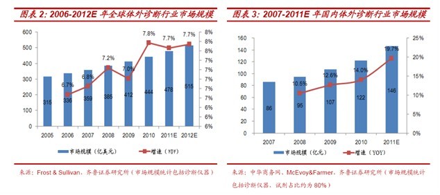 據(jù)McEvoy & Farmer 的市場報告《中國臨床診斷市場(2011)》預(yù)測,我國體外診斷行業(yè)未來增速有望達到15%-20%,遠遠超過全球5%-7%的增長,至2015 年成為全球第三大市場;
